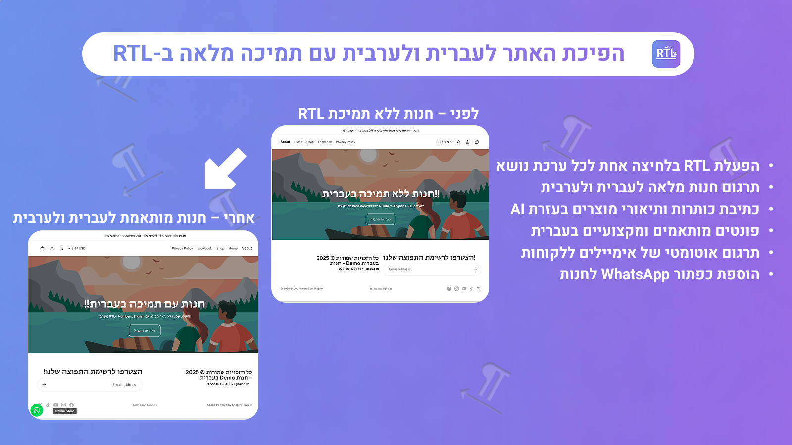 RTL Tools adds full right-to-left support to any Shopify theme without coding. The app adjusts layouts and text direction for Arabic and Hebrew stores. AI tools generate localized product titles and descriptions instantly. Translation options help convert existing store content. Optimized Hebrew fonts and a WhatsApp chat button improve communication and usability. All features work immediately after installation with no technical setup required.
