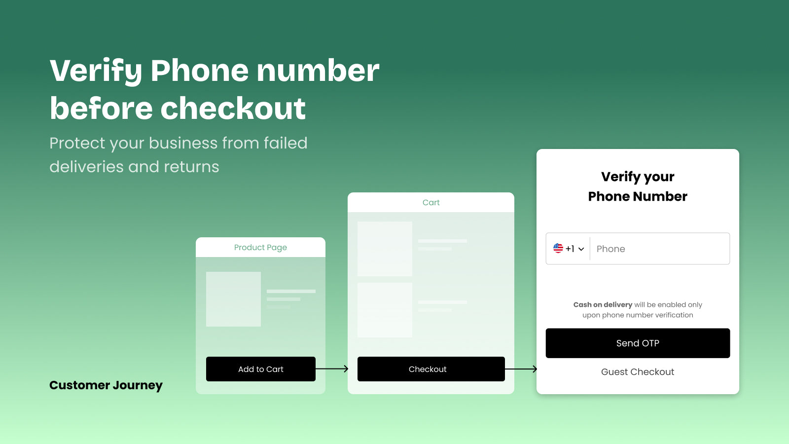 Easily verify customer phone numbers with OTP before checkout and hide COD for unverified customers.