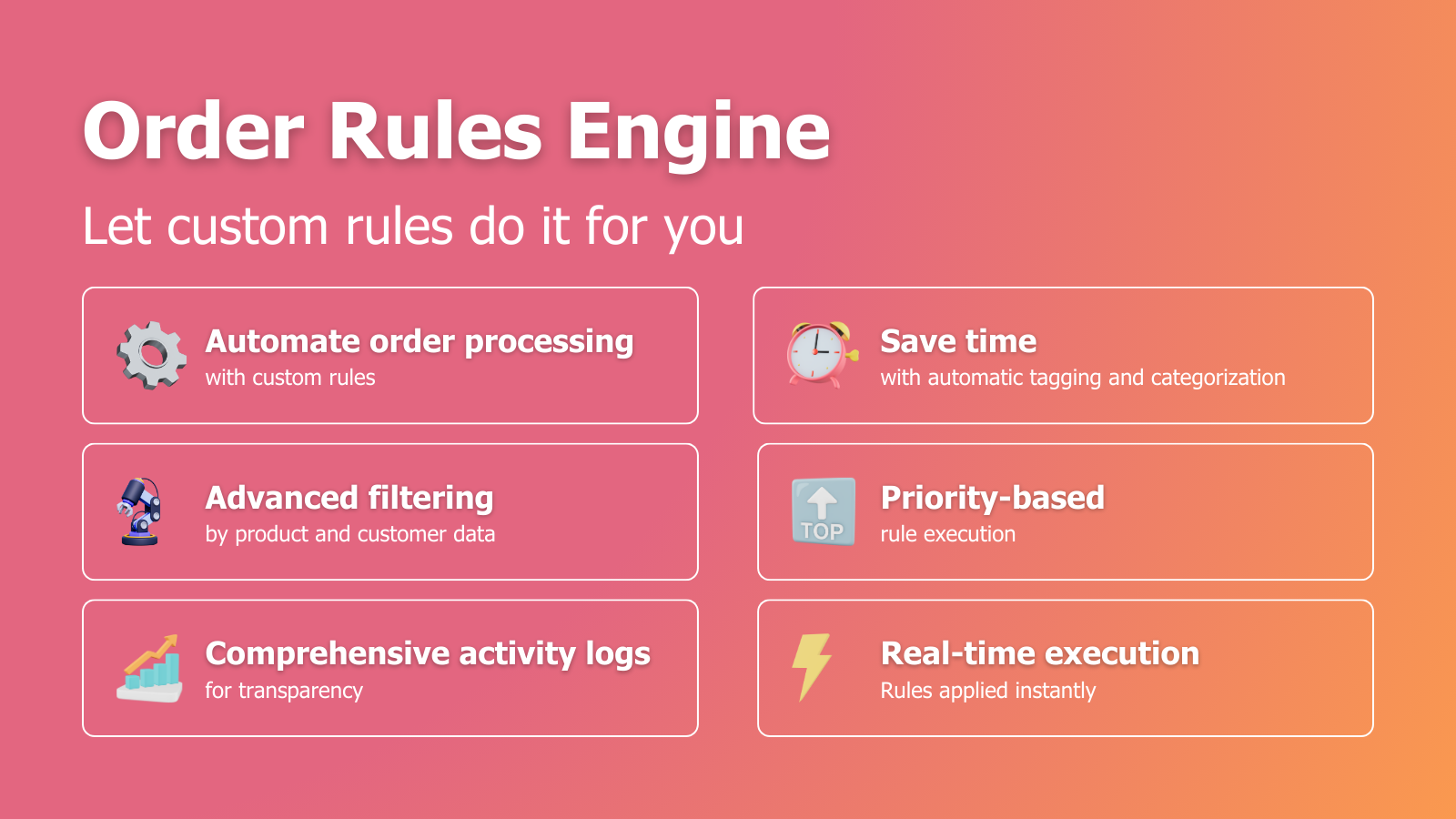 Create custom rules to automatically tag orders, add notes, and organize customers by order data.