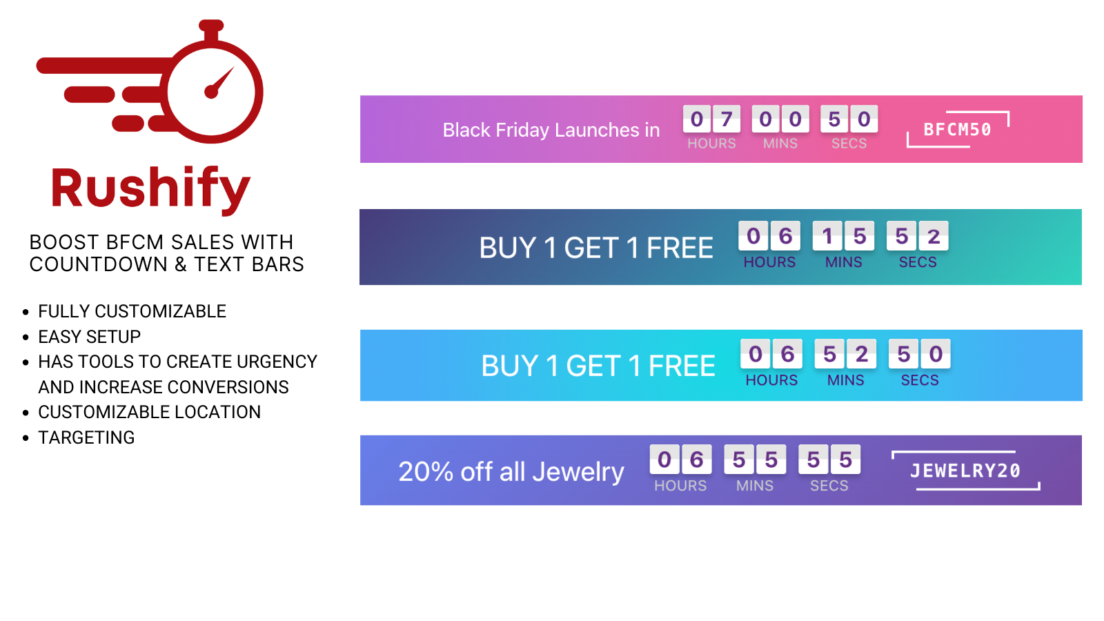 Enhance your Black Friday & Cyber Monday promotions with Rushify’s fully customizable banners, countdowns, and pop-ups. Create multiple announcements and display them anywhere in your store to drive urgency, create conversions, and maximize your sales.