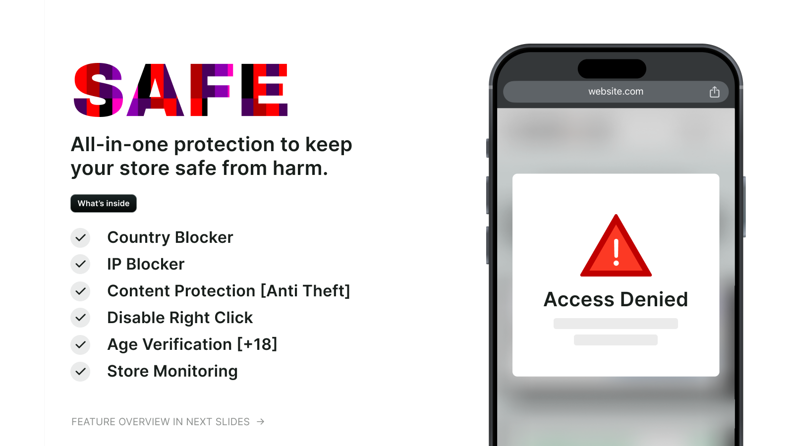 Country blocker, IP blocker, age verification, bot protection, anti theft & disable right click.