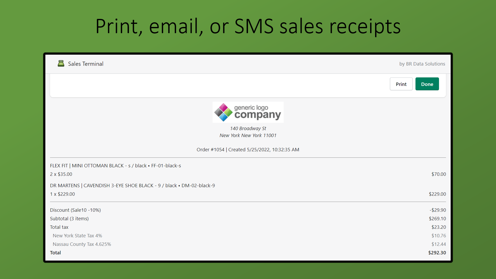 Use our POS app to sell in-store, exchange or edit items from old orders, and collect full, partial, or split payments. Exchange both online or POS orders and issue a refund or Shopify store credit for use online and in-store. Add custom discounts, discount codes, product discounts, or automated discounts to your orders. Sales Terminal POS is a replacement for Shopify POS that can be used either on a PC/Mac browser or via Shopify mobile on iOS/Android. Our POS works with any printer or scanner.