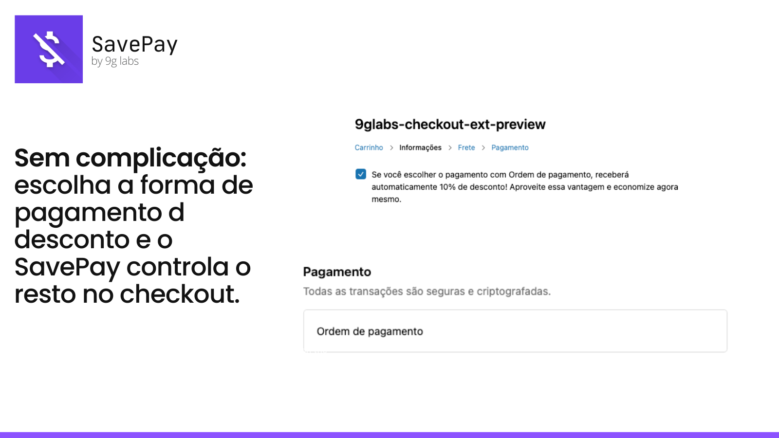 Agora você pode oferecer descontos automáticos para clientes para Pix e qualquer outro método de pagamento. Simples. Selecione a forma de pagamento (uma da lista ou escolha alguma que você tenha loja), o desconto e pronto: seu cliente já pode comprar com desconto. Se adapta ao seu checkout. Use todo o poder das extensões de checkout e escolha o melhor lugar para exibir a chamada do seu desconto, em qualquer lugar do checkout. Flexível. Escreva a melhor chamada de desconto para seu cliente.