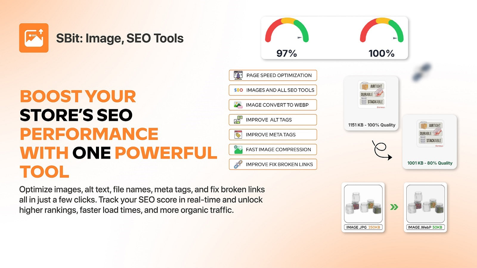 Sbit helps merchants optimize their store images and SEO elements to address common performance issues. The app compresses product images to reduce file sizes while maintaining visual quality. It converts images to WebP format for modern browsers. Merchants can manage ALT text for images in bulk and optimize meta tags. The app identifies and redirects broken links that may affect user experience. Speed testing tools help merchants monitor their store performance.