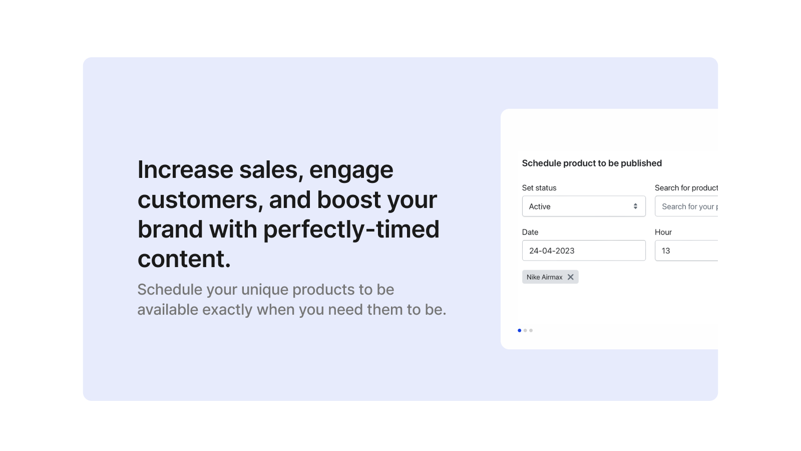 Introducing a scheduling solution for your Shopify store: ScheduleBee! Take control of your product and theme releases like never before. With ScheduleBee's seamless integration, effortlessly plan and automate your store's publications of your themes and products, ensuring timely launches and updates. No more manual work, no more missed opportunities! Increase sales, engage customers, and boost your brand with perfectly-timed content.