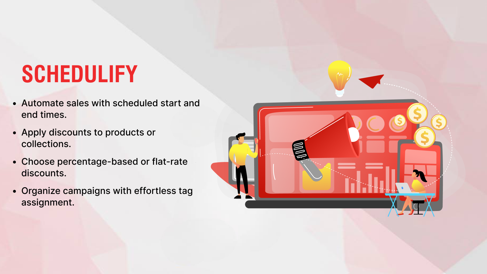 Schedulify is uniquely designed to simplify and consolidate sales campaign management into a single, powerful app. It combines automated scheduling, percentage-based or flat price discounts, and organized tag assignments, streamlining workflows and eliminating the need for multiple tools. It solves the problem of managing complex sales campaigns effortlessly. Schedule start and end dates, apply discounts to products or collections.