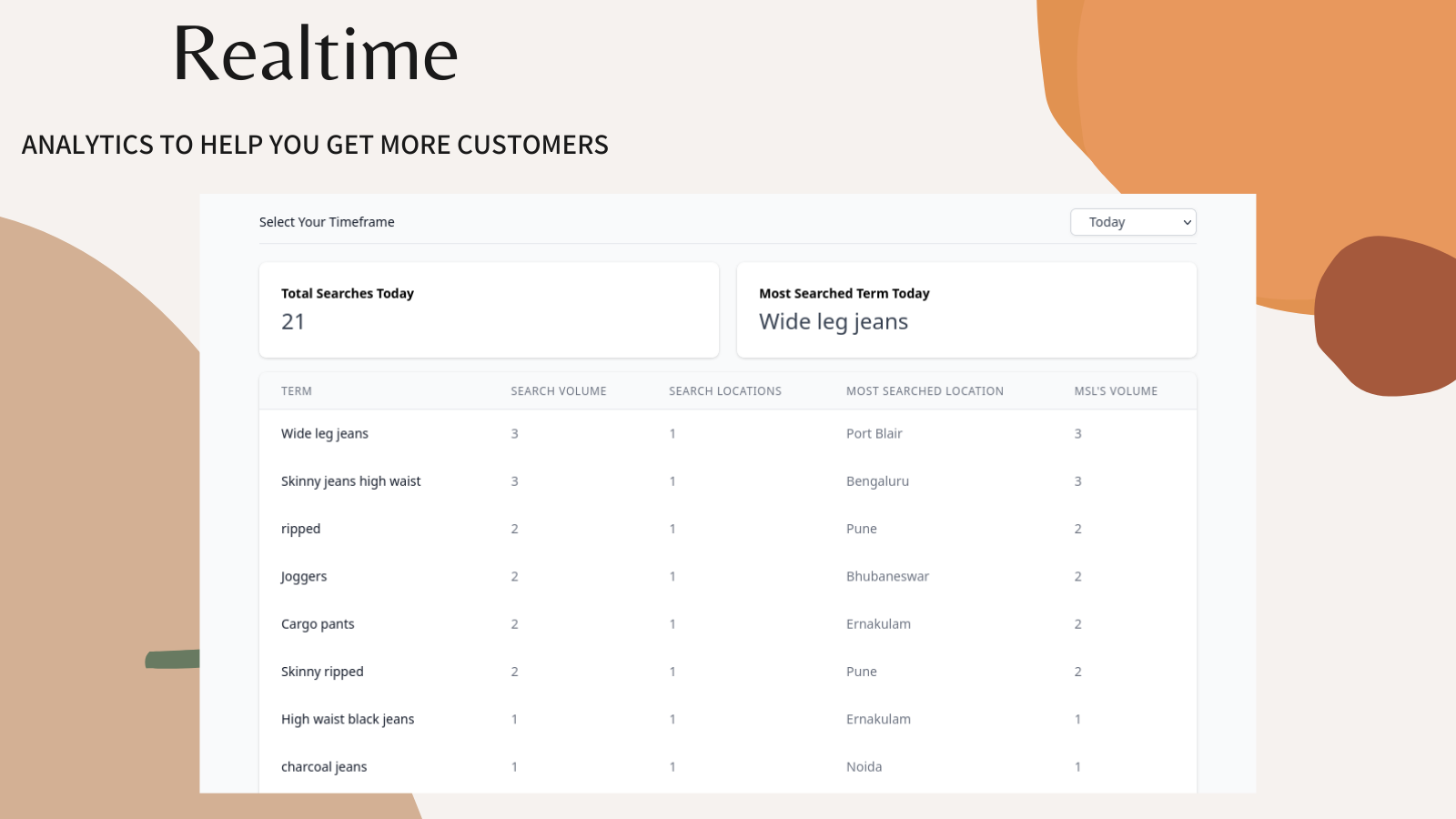 Searchmonitor monitors all search activity happening on your store and then provides a dashboard for shopkeepers to view the same. Shopkeepers can then use the data to - Rename products - Order more stock or SKUs - Identify trends and trend shifts - Know locations of users to target SEO campaigns - Better understand their customer needs