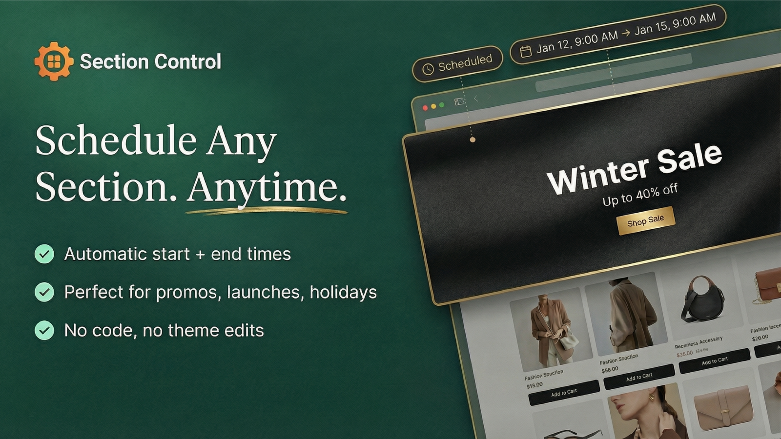 Control section visibility by date & time. Perfect for sales, holidays, and announcements.