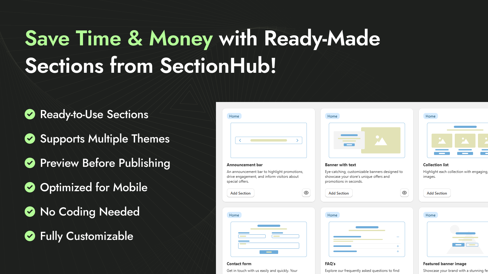 Ready-to-use theme sections. Fully customizable. Works with all themes - No Coding Needed!