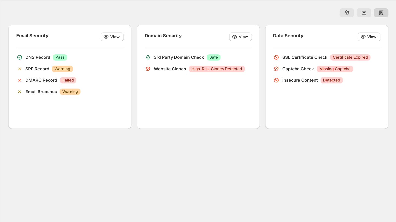 SecurEcommerce provides comprehensive security monitoring for your Shopify store. Our platform detects cybersecurity threats across critical areas - from brand impersonation, phishing sites and store clones, to data breaches and email spoofing. Get alerts when threats are identified and access detailed security insights through our dashboard. Protect your brand reputation, store data, and business operations from threat actors and fraud with automated security monitoring.