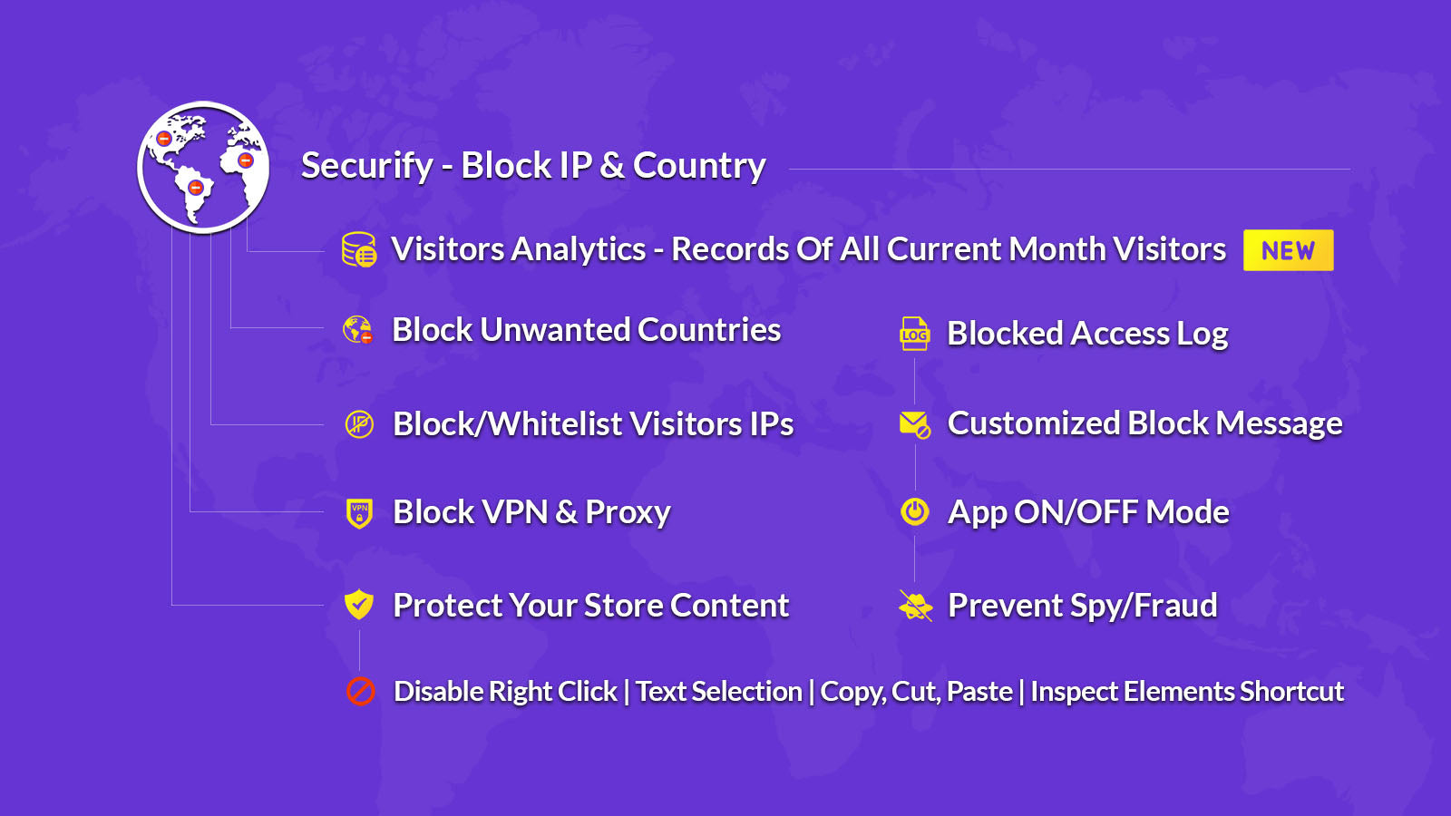 Our easy IP and country geolocation blocking app enhances the security of your store by blocking VPN, Proxies, and unwanted visitors access based on IP addresses and countries. It's a crucial tool for merchants who want to prevent unauthorized access and protect their content, business, and customers from malicious traffic, fraud, and spying. Also, you can find IP addresses & visitors data to blacklist unwanted access. It's easy to use and integrates seamlessly with your store in a few clicks.