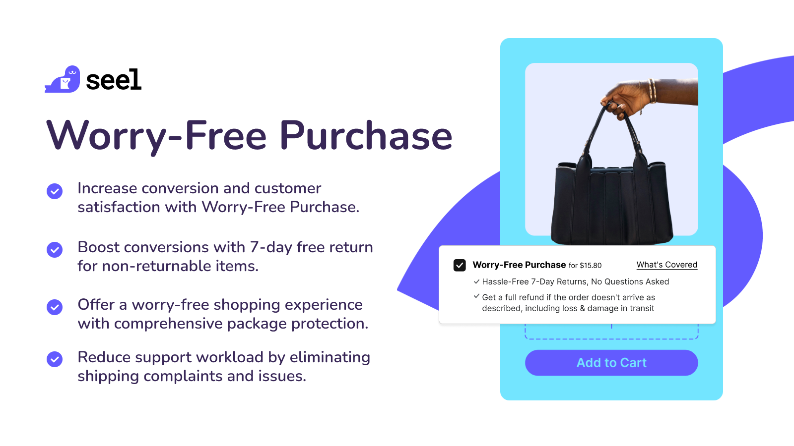 Elevate customer satisfaction with Seel Worry-Free Purchase. Offer comprehensive coverage for return, missing/ damaged items and more, ensuring a worry-free shopping experience. Customers resolve issues seamlessly through Resolution Center, while you manage it all effortlessly in one Dashboard. Protect your hard-earned customer relationships and foster repeat business by providing a safety net for purchases.