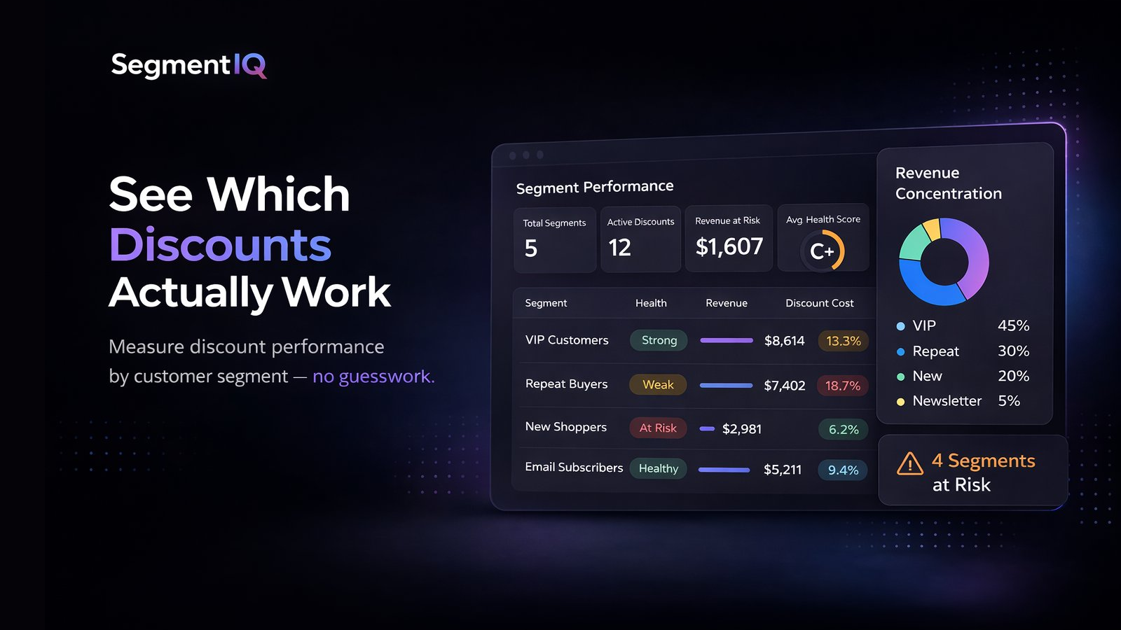 SegmentIQ connects to your store and reads your existing order, discount, and customer segment data. It breaks down discount performance by segment so you can see exactly where your discount strategy is working and where it is not. Automated insight badges flag segments with unusual discount patterns, such as segments where most orders rely on discounts or segments that receive no discount offers at all. Completely read-only. Never modifies your store data.