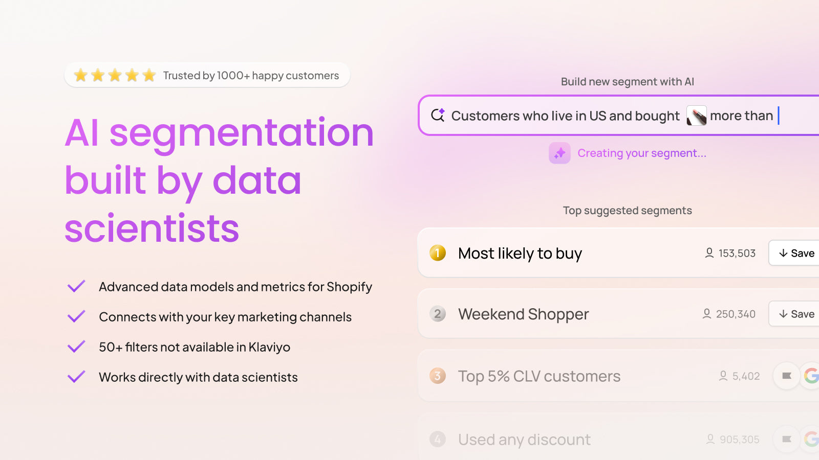 Data is critical for marketers, but raw data isn’t usable. You need a tool that not only analyzes data but translates it into actionable insights. Enter Segments; we built the ultimate customer data analytics tool drawing on our deep experience as former LinkedIn data scientists. Surface the most effective customer segments for your marketing campaigns, then keep them in sync everywhere: Right message, right customers, right time. We are Shopify Plus Certified, incl. in Shopify's Retention Guide