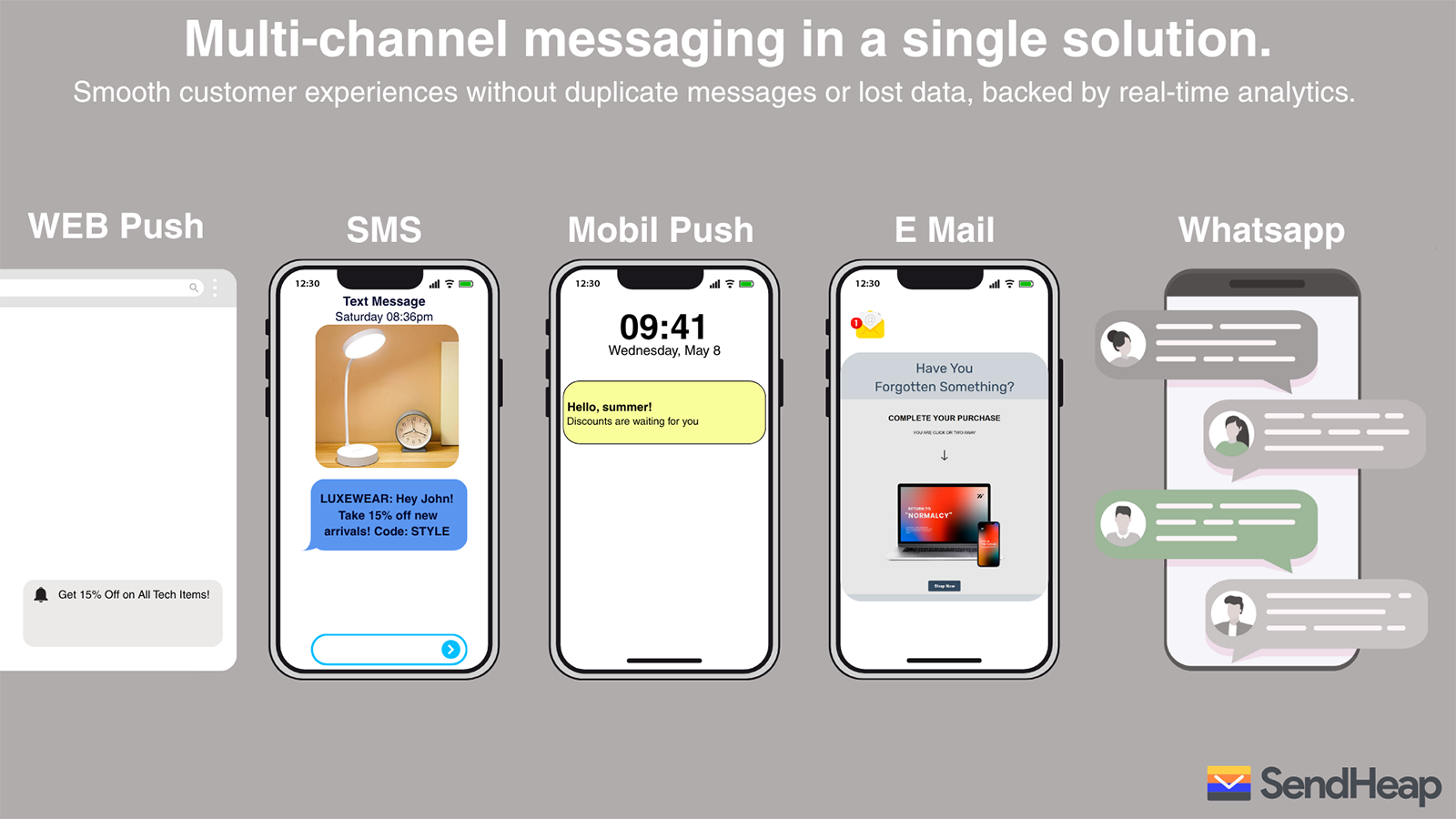 SendHeap automates e-commerce marketing for Shopify stores, streamlining customer engagement with personalized email, SMS, web, and mobile push notifications. Features include abandoned cart recovery, order updates, stock alerts, and gamification tools like prize wheels. Merchants can segment customers by behavior or demographics, use pre-built templates, and track performance with analytics. API integration ensures seamless operation, enhancing customer trust and loyalty.