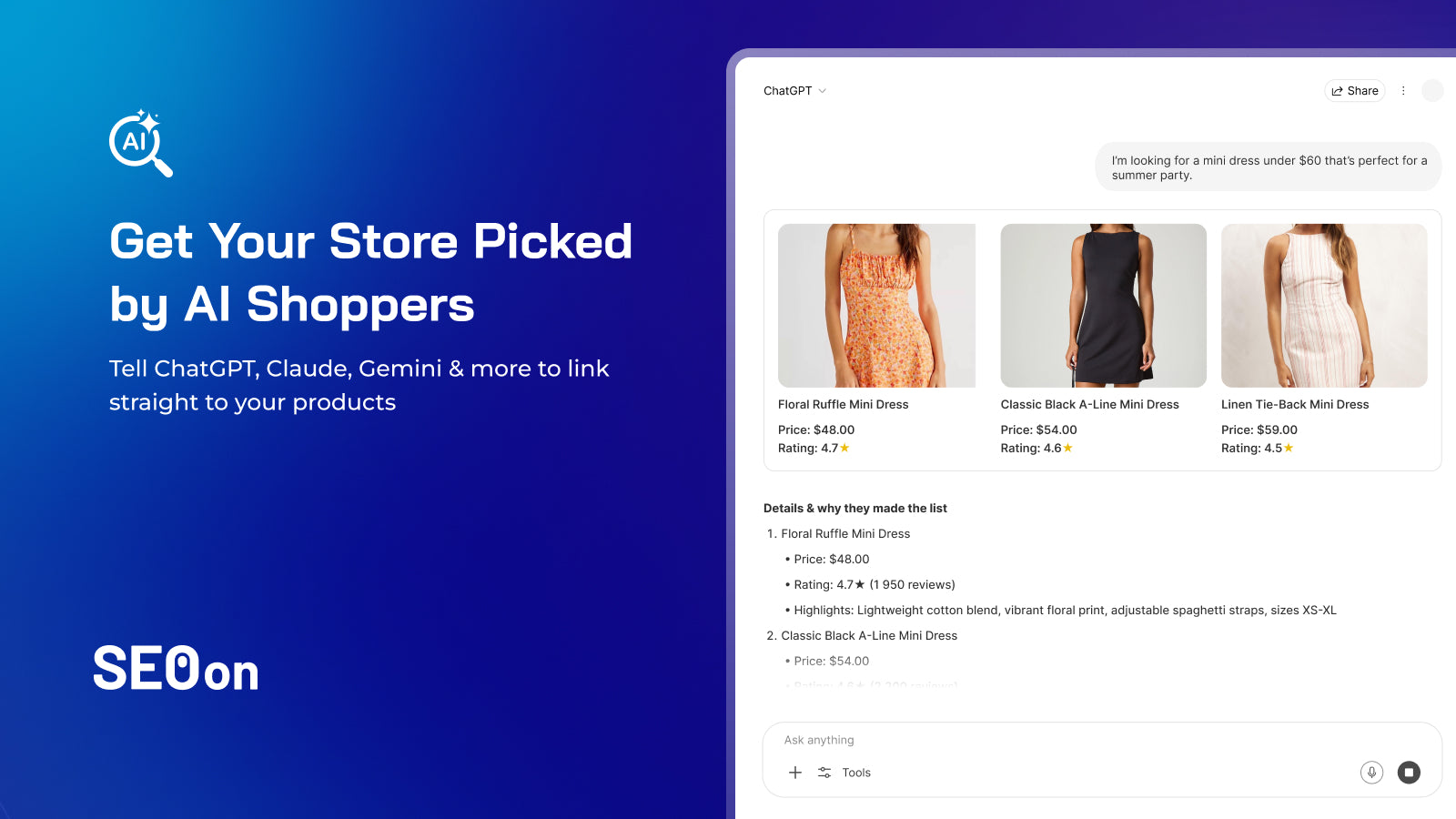 Get SEO score. Improve SEO. Optimize Products. Drive traffic.