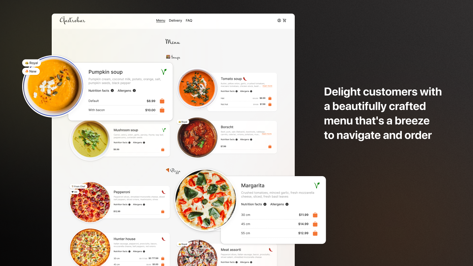 Present dishes and drinks on your website as an elegant, functional, customizable cafe menu.