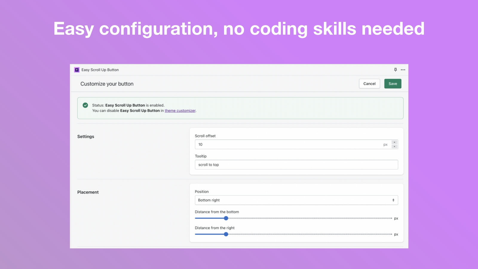 Easy Scroll Up Button is a simple way to create scroll to top buttons with minimal setting and configurations. Increase website's accessibility. Make it easier for user to scroll back to the top of the page. No coding skills needed. GUI-based interface which has a high customization, any updates can be applied nearly at once. Compatible with all Shopify themes and and will not affect the current theme. Displayed well in both Desktop and Mobile.