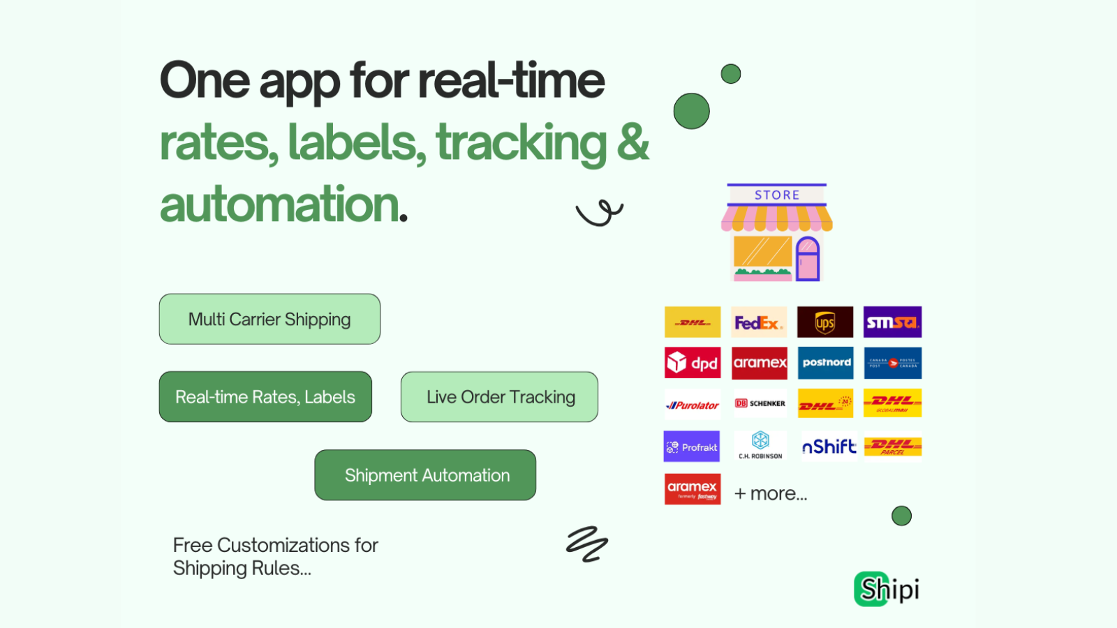 Shipi helps Shopify merchants automate their entire shipping workflow - from live rate calculation to label generation, fulfilment, and real-time tracking - across 15+ carriers including DHL Express, FedEx, UPS, Aramex, DPD, PostNord, and more. Whether you ship locally or globally, Shipi makes shipping smooth, reliable, and easy to manage inside Shopify. Custom functionality can be added per request.