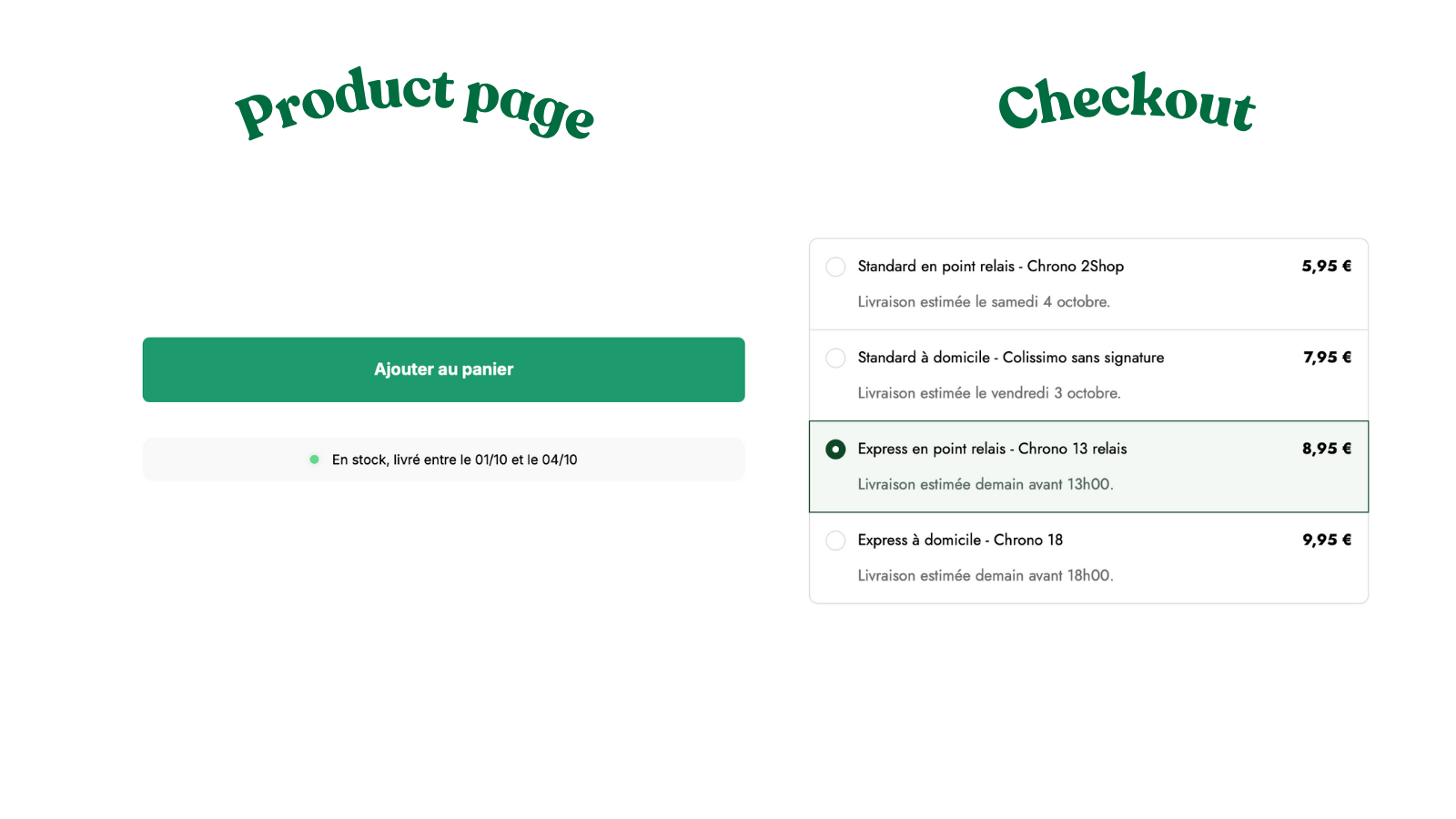 Affichez des délais de livraison précis directement sur vos pages produits et au moment du paiement.