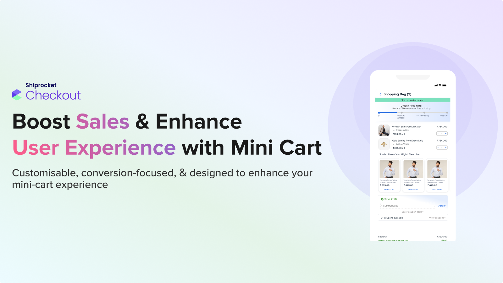 Drive sales with a customizable, conversion-driven mini-cart. Display dynamic progress bars, dynamic product suggestions, freebie discounts, and smart discount options. Tailor the cart’s design to reflect your brand theme. Helps in boosting order value (AOV), reduce cart abandonment, and provide a smoother, more engaging shopping experience.