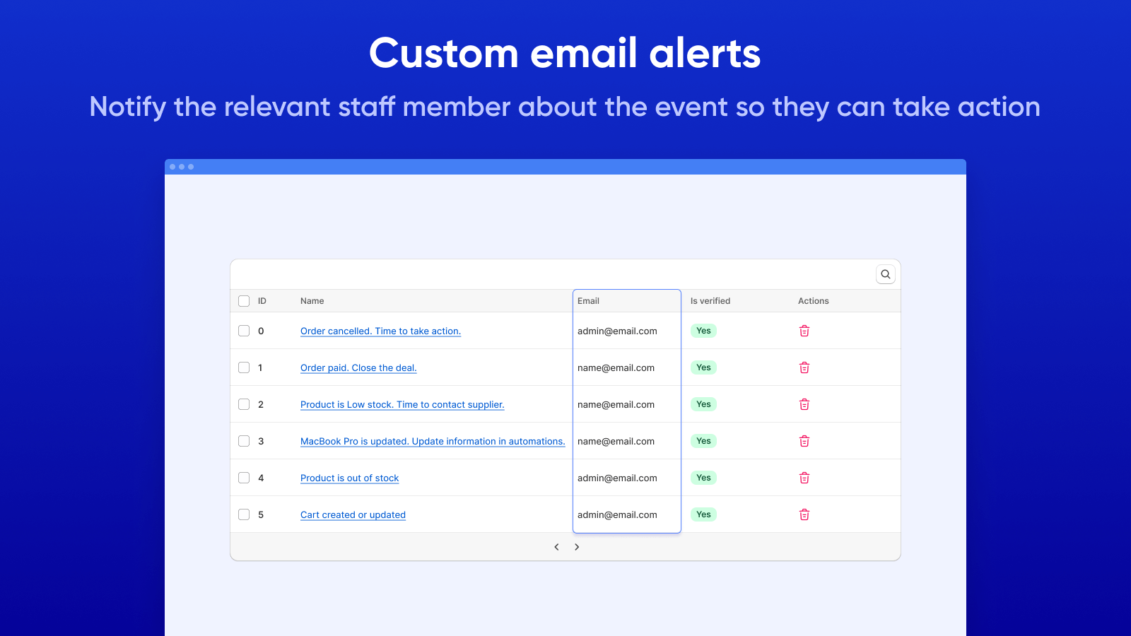Stay on top of new orders, low stock, and key store events with email alerts for you and your team.