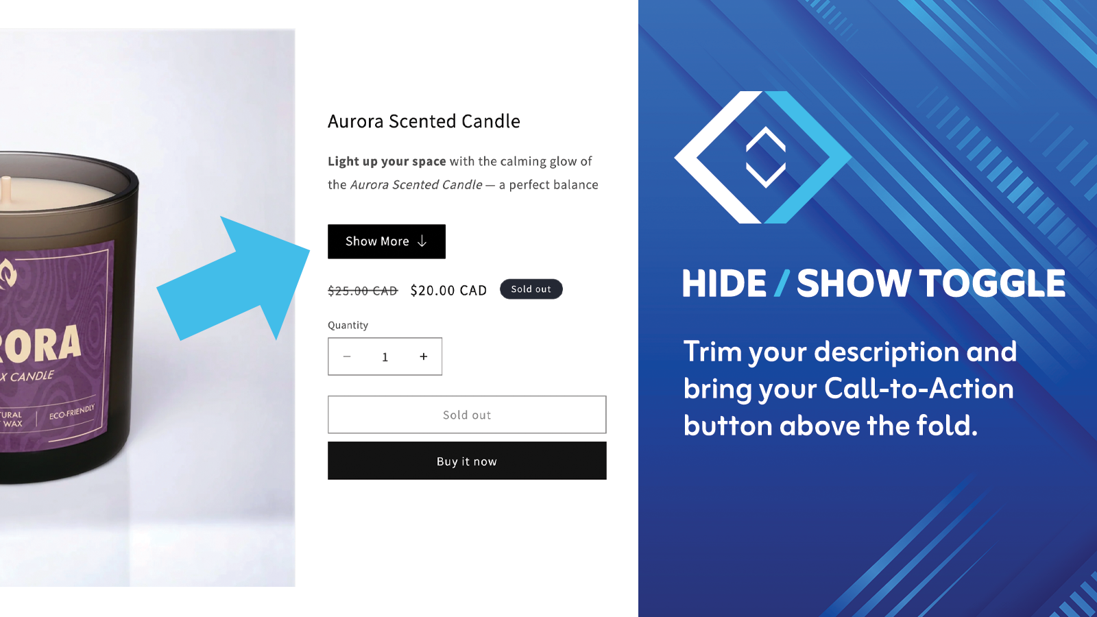 Trim down uneven product descriptions that clutter your store and bring your Call-to-action button above the fold. Take full control of how your product details appear. Set the number of words displayed by default, and add a customizable “Show more / Show less” button to reveal the full text. Create a cleaner and consistent product layout and reduce endless mobile scrolling without manual edits, description rewrites or coding development.