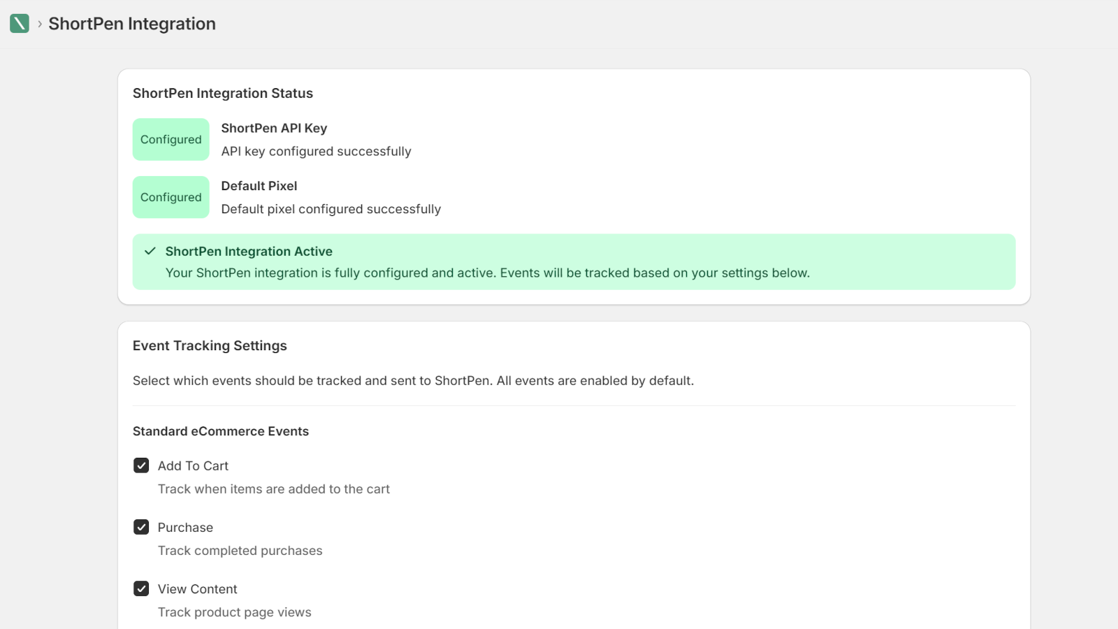 ShortPen helps merchants track key customer actions by automatically adding a tracking pixel to their store. Once installed, it captures important events such as product views, add to cart, and purchases. This allows merchants to precisely understand customer behavior and improve marketing performance through the ShortPen platform.