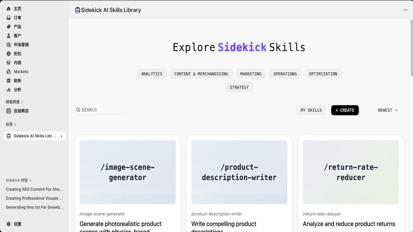 Equip Sidekick with expert skills and structured prompts for automated store ops.