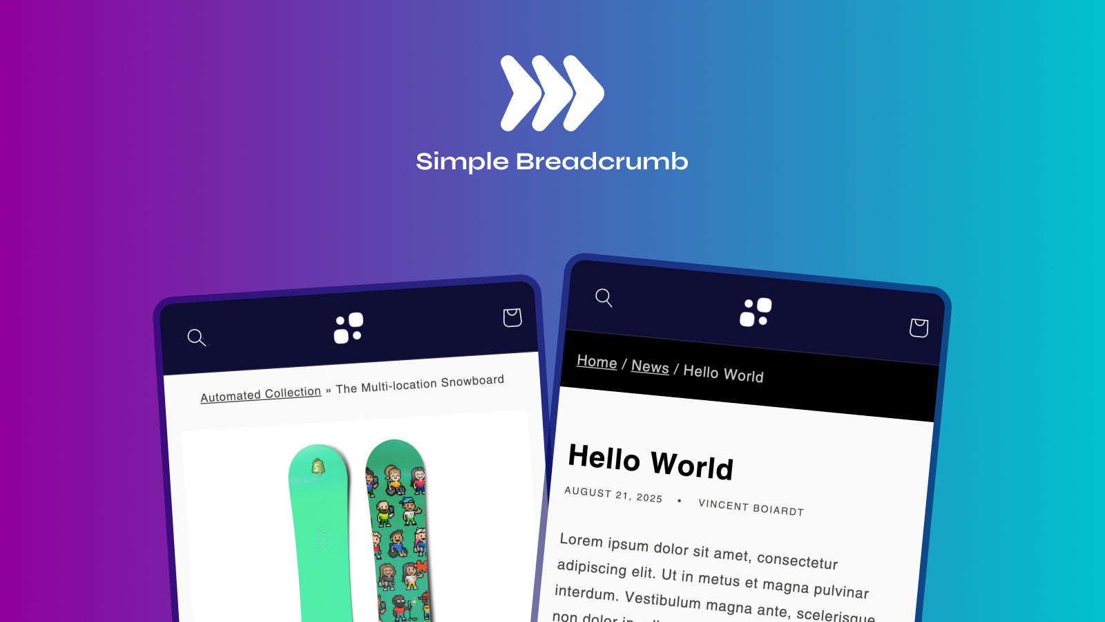 Revamp your product pages with breadcrumb navigation! Designed to enrich your customers' navigation experience and enhance your store's SEO. Seamlessly integrate breadcrumbs that match your store's theme, customize dividers and more!. By making your site more user-friendly, Simple Breadcrumb not only enhances the user experience but also helps decrease bounce rates and promotes product discovery. It's time to power up your store with breadcrumb navigation and improved SEO.