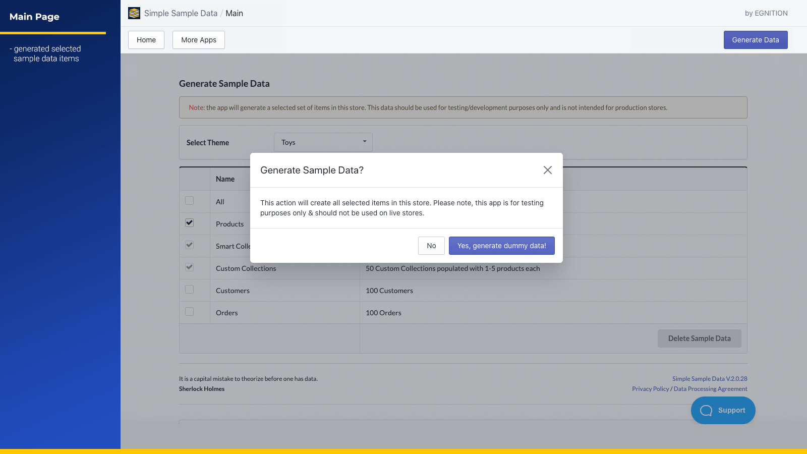 Generate sample data with a single click. Choose from three different sample datasets to populate your store with dummy data. Use the "clothes/accessories" theme which supports products with multiple variants (size and color). Use the "paintings" theme which supports single variant (option) products. Use the "toys" sample data theme which supports single variant (option) products. Generate products, smart and custom collections, customers, and orders. Easily remove Shopify test data.