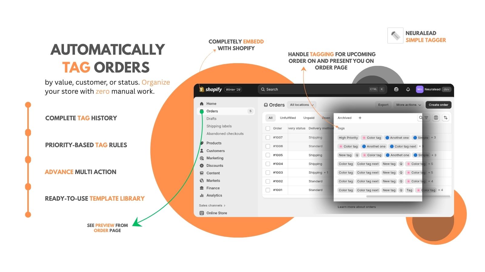 Simple Tagger automates tagging for orders, products, and customers. Create simple rules based on conditions like order value, product type, or customer location. When conditions are met, tags apply automatically without manual work. Set up your first automation in minutes with no coding required. Monitor performance through activity logs that show success rates and execution history. Perfect for merchants who want organized data and more time to focus on growing their business