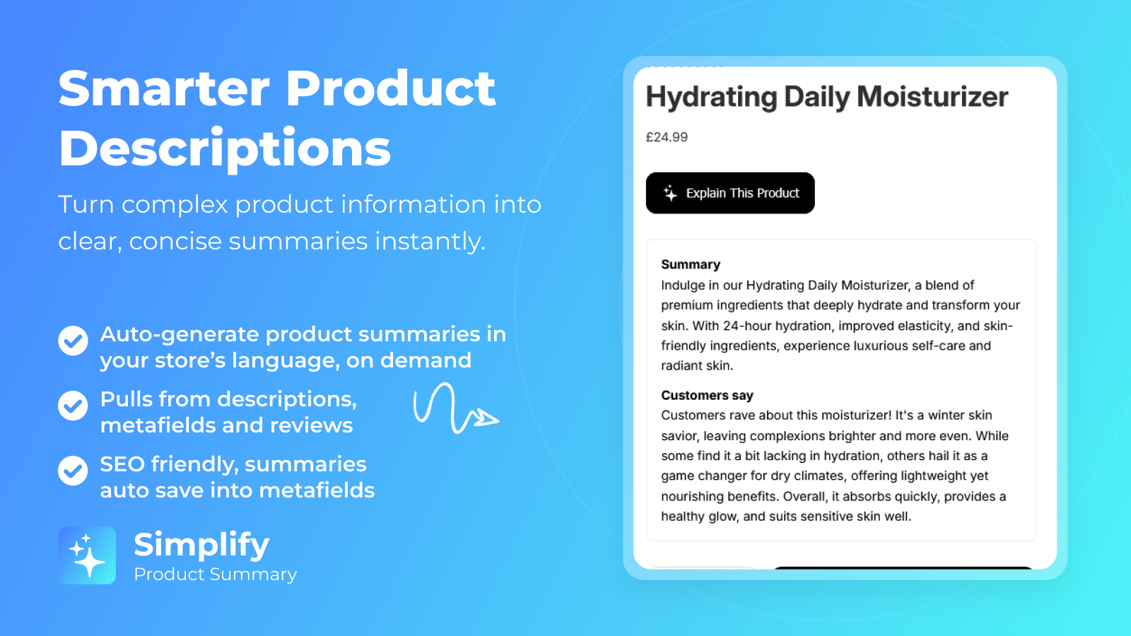 Save time and elevate your product pages with smart, auto-generated summaries. This app transforms your product descriptions, metafields and reviews into clear, engaging summaries that fit your brand voice and store language. No manual writing, no coding, just polished, consistent content across your catalog. Give shoppers the info they need, faster.