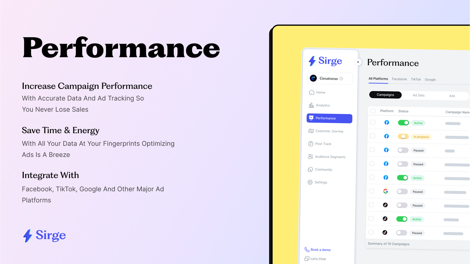 Stop wasting time, start growing! Sirge uses AI to supercharge your marketing across Facebook Ads, TikTok Ads & Google Ads. Personalized Growth Roadmap: Get a data-driven plan to skyrocket sales & revenue. Actionable Insights & Recommendations: Optimize campaigns for more orders & conversions. Effortless Campaign Management: Track, analyze & optimize - all in one place. Sirge is your AI growth partner. Sign up & unlock explosive growth!