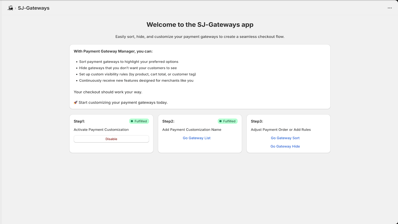 Our app makes it simple to manage payment methods at checkout. You can sort gateways to highlight the most relevant options, hide those that don’t apply, and set custom visibility rules by product, cart total, or collection. More options will be added over time, and we welcome merchant feedback to help guide future improvements.