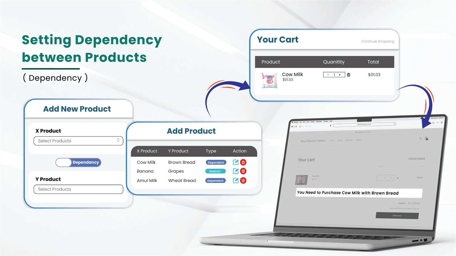 Apply restriction & dependency to products as per your business needs. Restrict buyers from purchasing items that are incompatible together & set dependency between products that are related. Create as many pairs of dependent & restricted products as you want. Restriction & dependency rules can be applied in between collections. Simply product inventory by allowing or restricting customers from purchasing the products in accordance with predefined combinations of restrictions & dependencies.