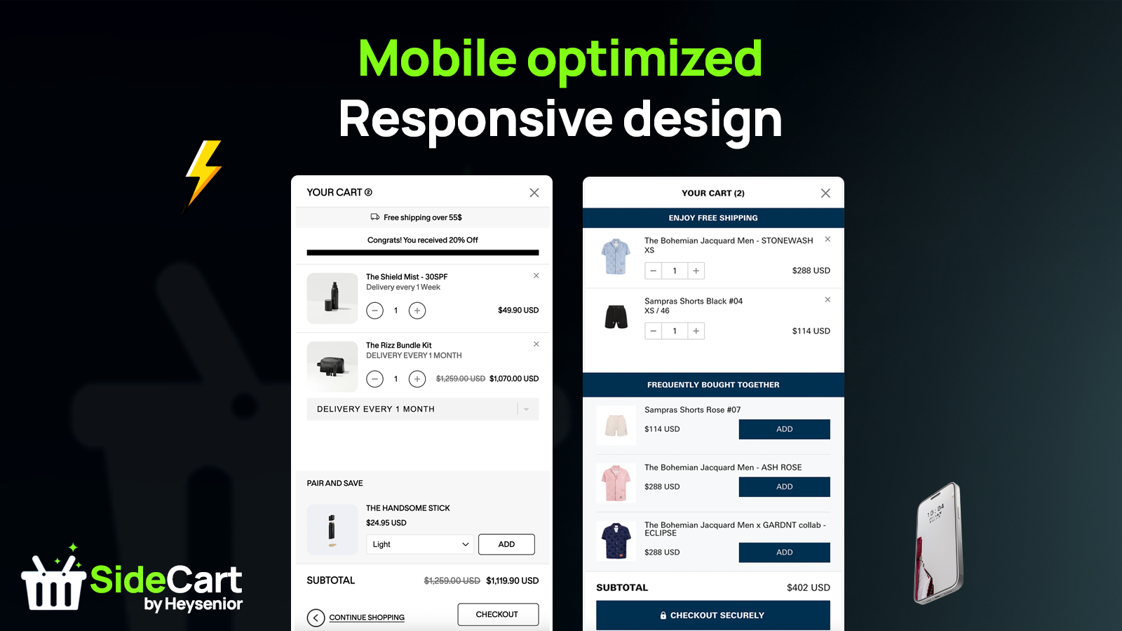Slide Cart Drawer—Cart Upsell Customize your cart drawer to fit your store. Grow average order value with add to cart bar, free gifts, frequently bought together, shipping protection, discounts and more. It enables you to add a cross sell or upsell function, you can add important ads like promotions, sales and products, you can motivate your customers to spend more by rewarding them for their purchases with discounts or free shipping.