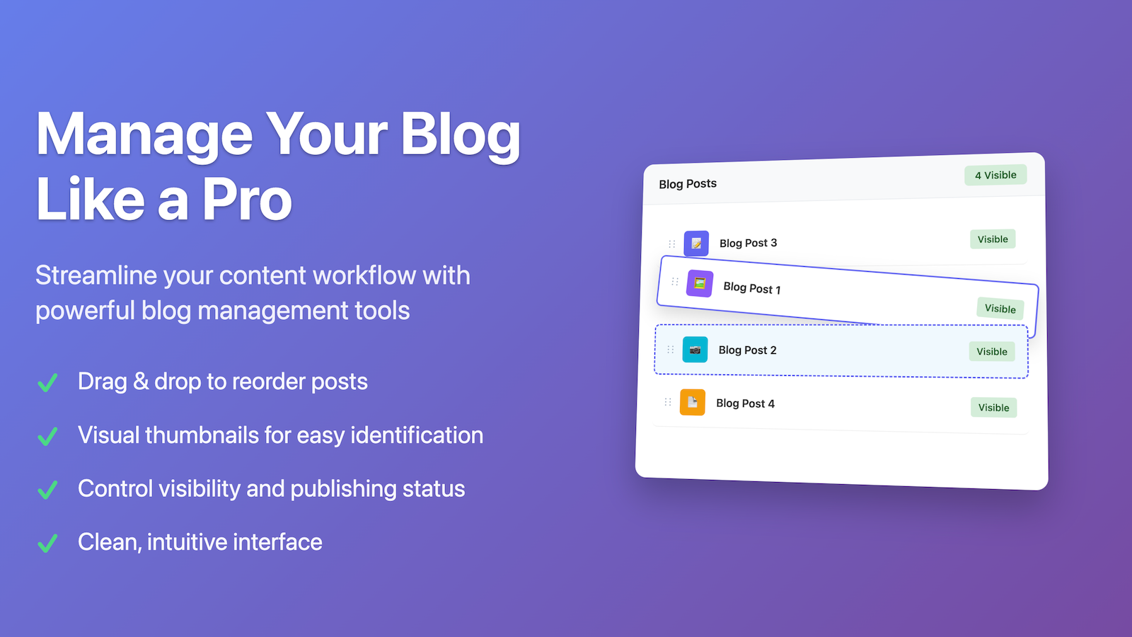 Smart Blog Post Sorter allows you to reorder your blog posts with a simple drag and drop interface.