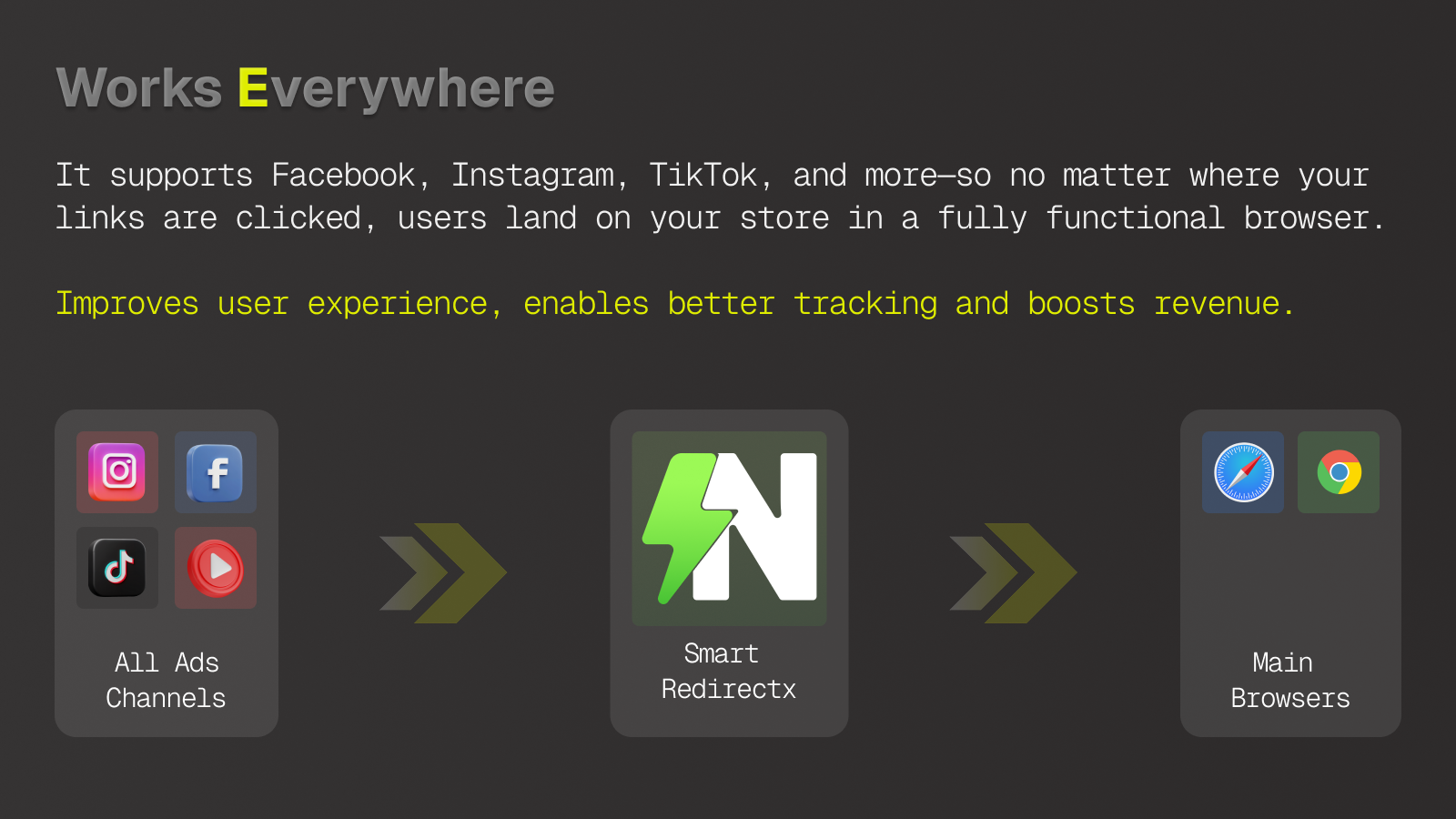 Smart Redirectx automatically moves shoppers from social media in-app browsers to their trusted native browsers, ensuring full website functionality, faster load times, and smoother checkouts. It accurately maintains tracking parameters, enhancing your analytics and retargeting efforts. Installation is straightforward and requires no technical setup, enabling you to effortlessly enhance customer experience and improve your store’s conversion rates immediately.