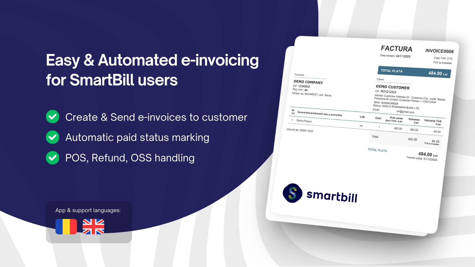 Connect your Shopify store with SmartBill and automate your invoicing with ease. This integration ensures legally compliant invoices across the EU, Designed for growing B2B and B2C businesses, it creates and sends invoices automatically based on your Shopify orders—saving time and reducing errors. Stay compliant, stay efficient — with the official SmartBill invoicing integration for Shopify.