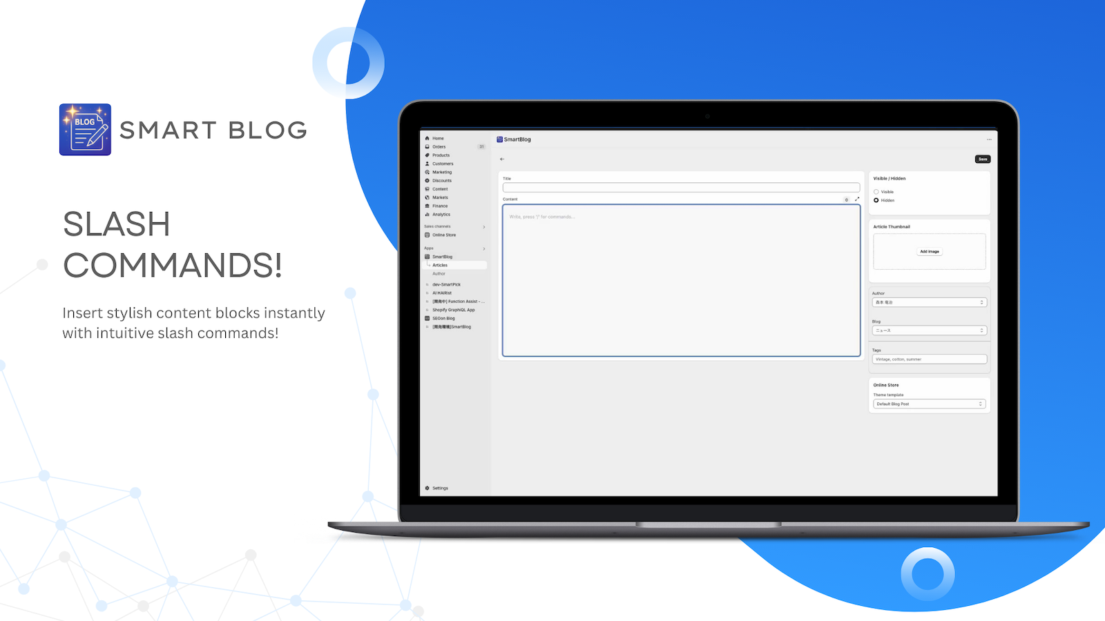 SmartBlog lets you create and edit blog posts on your Shopify store just like you would in Notion. With slash commands, you can insert stylish blocks instantly, and decorate your text easily by simply selecting it. No more clunky editors — focus on writing content that converts and looks great on your store. Whether you’re writing announcements, guides, or SEO-friendly articles, SmartBlog makes blogging smooth and delightful.
