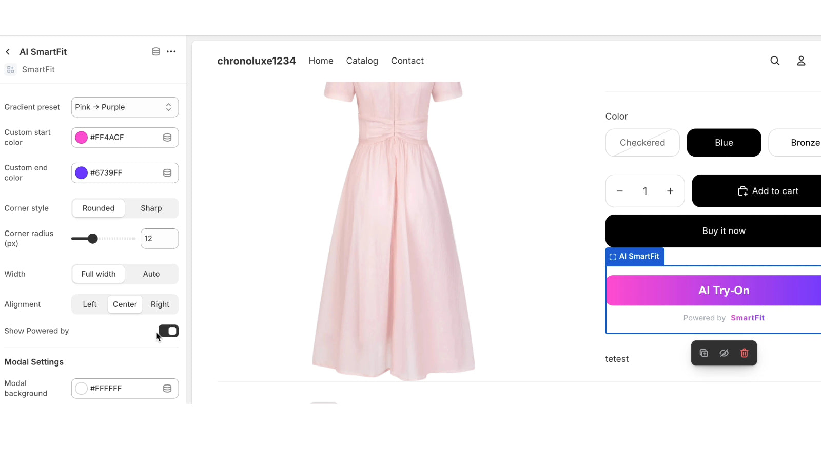 Allow shoppers to try on all product categories: from clothes, apparel and electronics to home goods, using a simple photo upload or camera capture. Customize the button, welcome screen, and result experience to match your brand. SmartFit reduces purchase hesitation, increases buying confidence, and turns browsers into buyers through a frictionless, engaging journey.