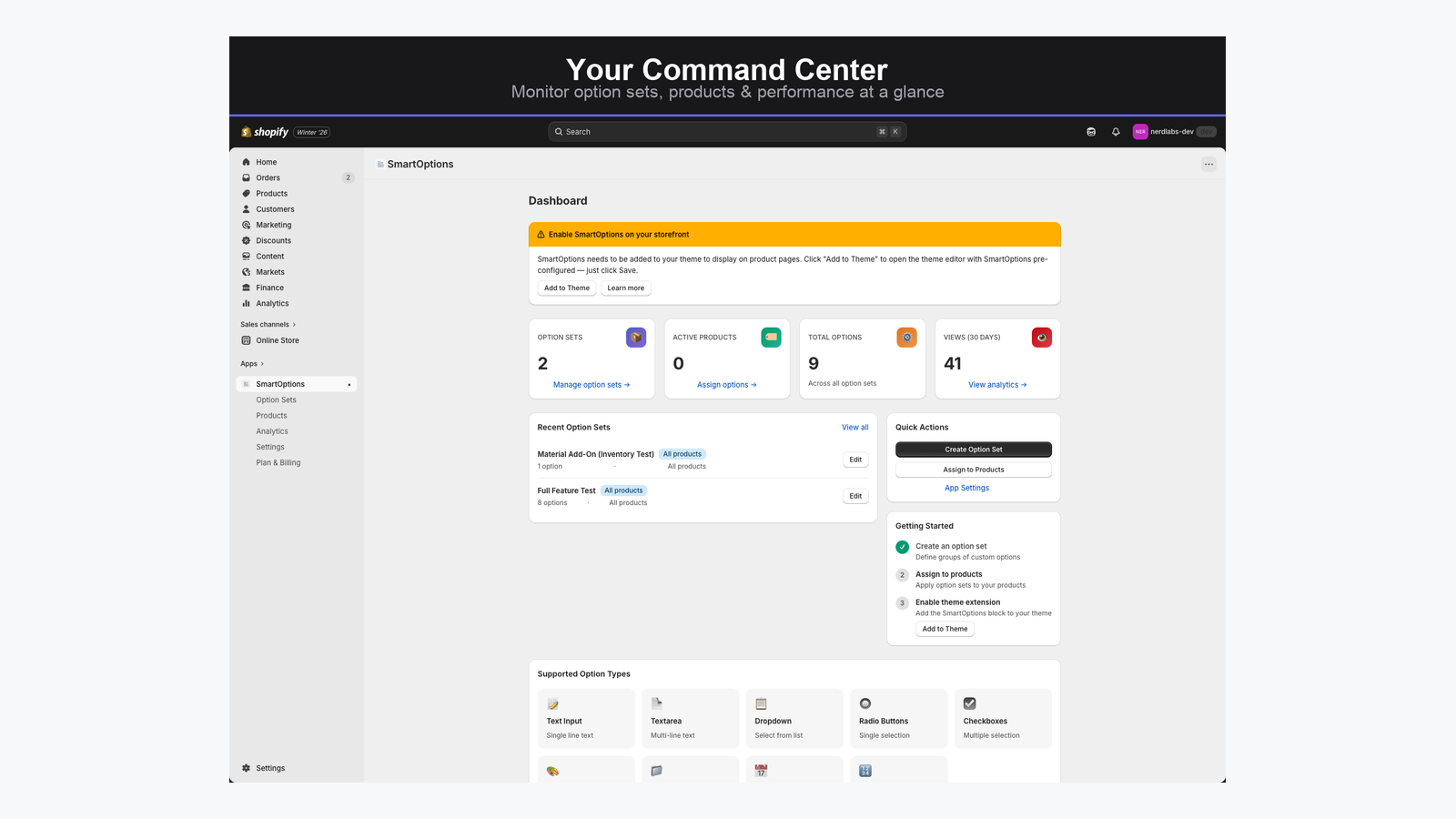 SmartOptions lets you go beyond the built-in variant limit by adding unlimited custom fields to any product. Choose from 10 option types including text inputs, dropdowns, color swatches, date pickers, and more. Add-on amounts are automatically included as line items at checkout. Smart targeting applies option sets to specific products, collections, or all products. One-click theme installation works with all Online Store 2.0 themes. Cascading option choices are available and work with inventory.