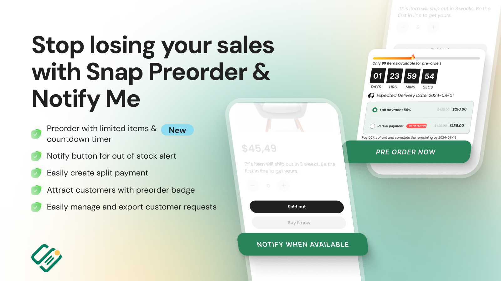 Snap Preorder and Notify Me helps rock your sales with complete business strategies. First, setting up preorder/ presale / preorder badge for unreleased products can leverage scarcity to drive demand. Second, Full/partial payment options ensure a steady cash flow and facilitate accurate market demand. Thirdly, Back-in-stock alerts mitigate lost sales by hitting notify me button when replenishing out-of-stock items. Lastly, you can manage and export as CSV for preorder and BIS requests easily.