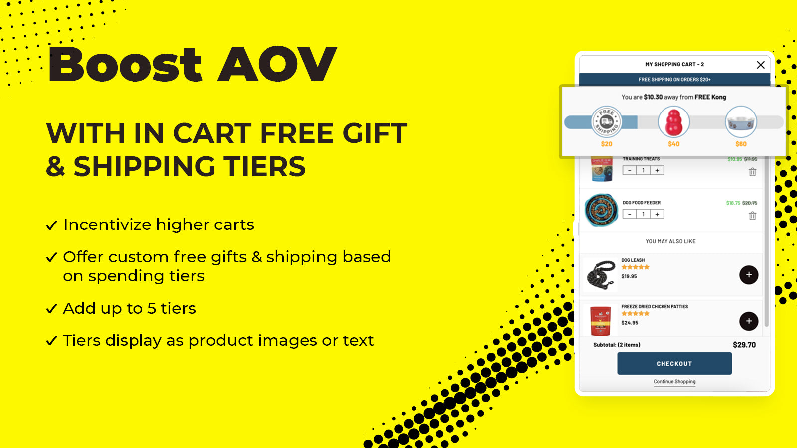 Personalize your shopping cart to align seamlessly with your brand identity with our fully customized, easy to use settings! Increase average order value in minutes with our fully automated multi-tier progress bar; as your customers spend more, FREE gifts automatically add to cart seamlessly with NO code or scripts. Enhance your customers checkout experience with in cart upsells, cross-sells, and order upgrades - shipping protection, shipping insurance, gift wrapping, and more!