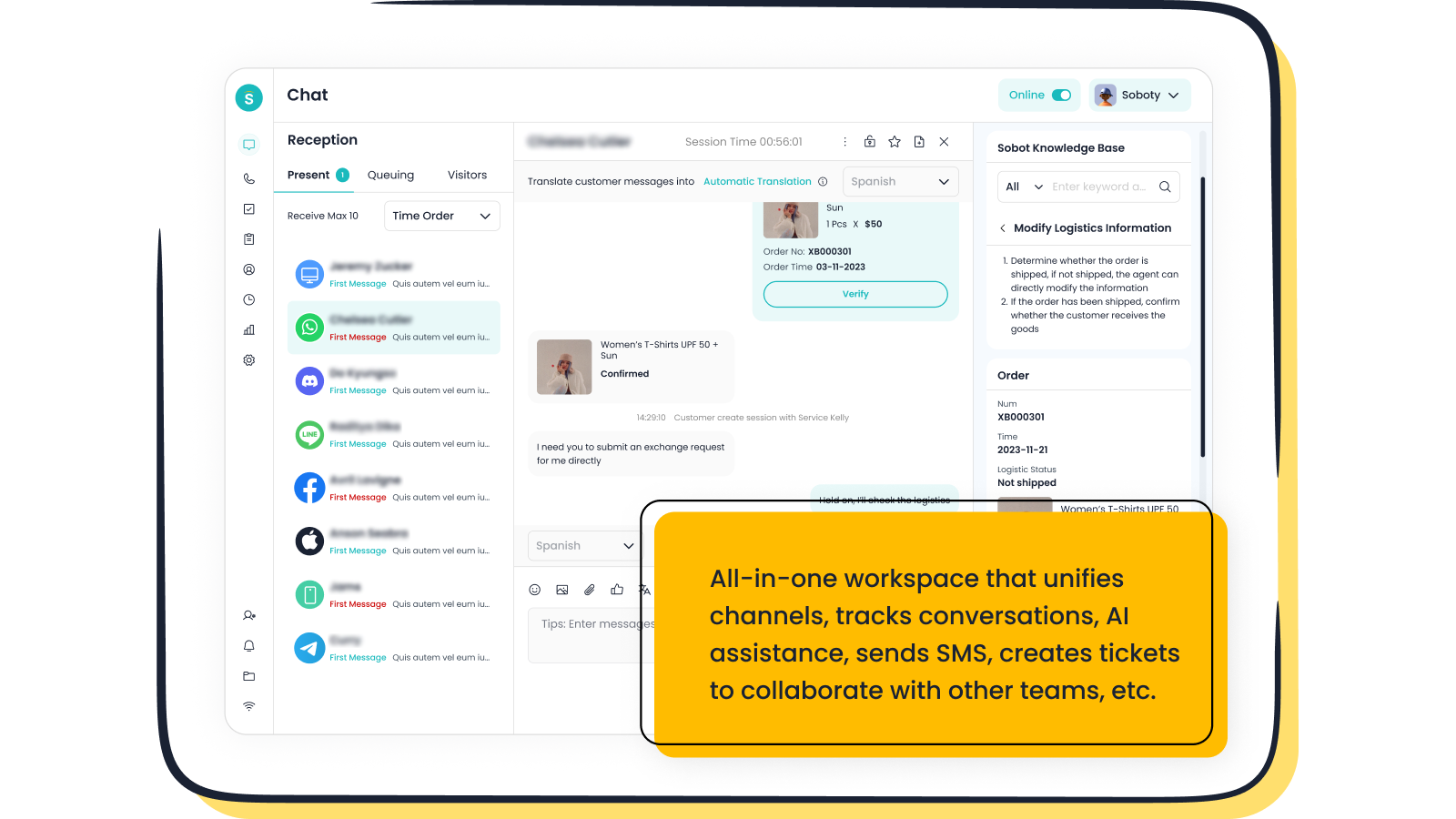 For Shopify users managing multiple online channels, such as websites and social media platforms, Sobot offers a unified inbox that consolidates tickets, messages, and customer data into a single AI-enhanced workspace, tailored to your language preferences. This integration facilitates efficient customer service by agents. Moreover, Customer and order information collected from Shopify can be utilized by Ticketing and the Call Center for customer engagement.