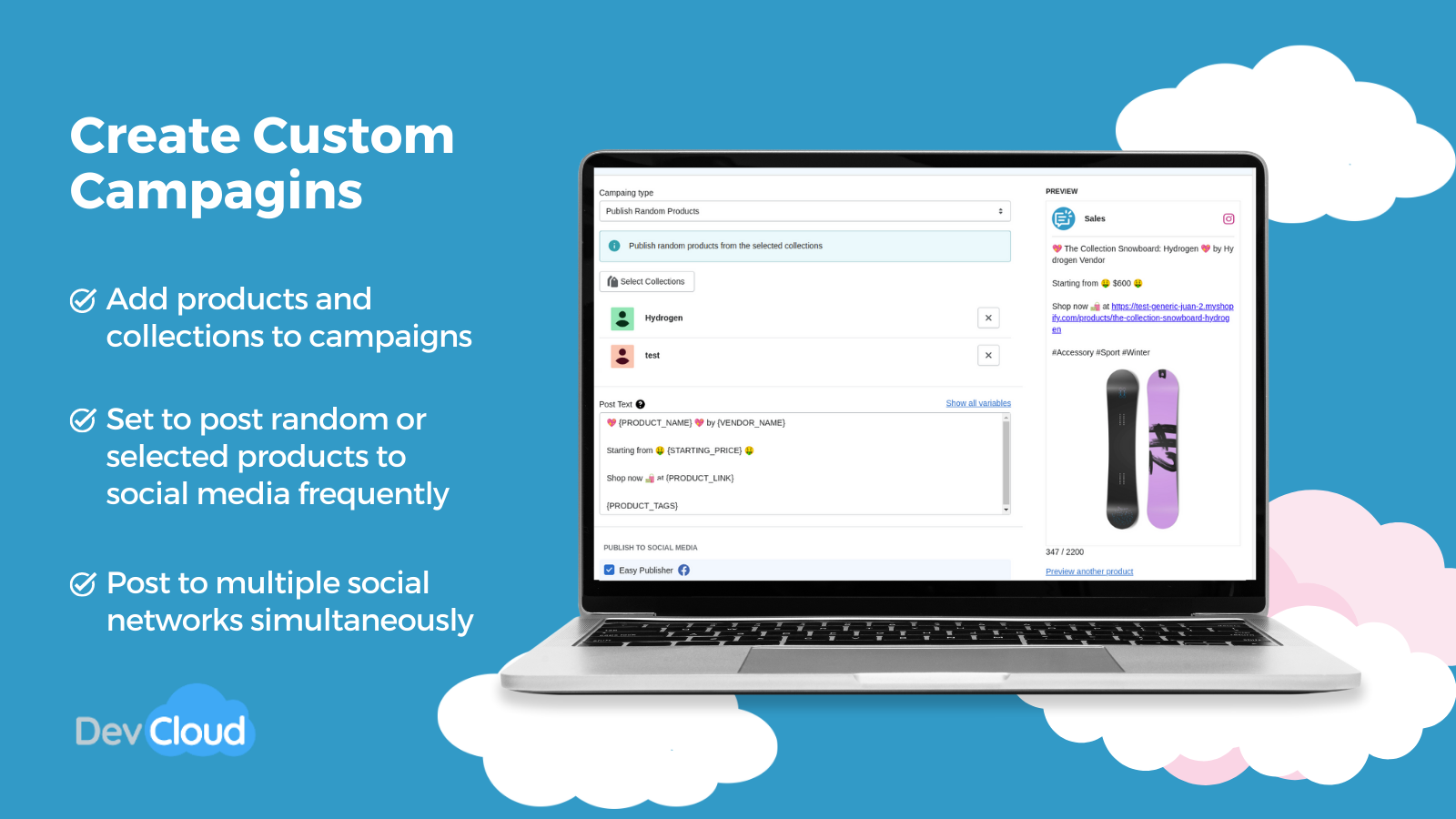 Easy Social Media Publisher allows you to publish products automatically from your store to social media like Instagram, Facebook, Twitter and Pinterest. Set campaigns to schedule publications at different times and dates to improve products visibility on social media! Fully customize the post text publications with the product data and images.