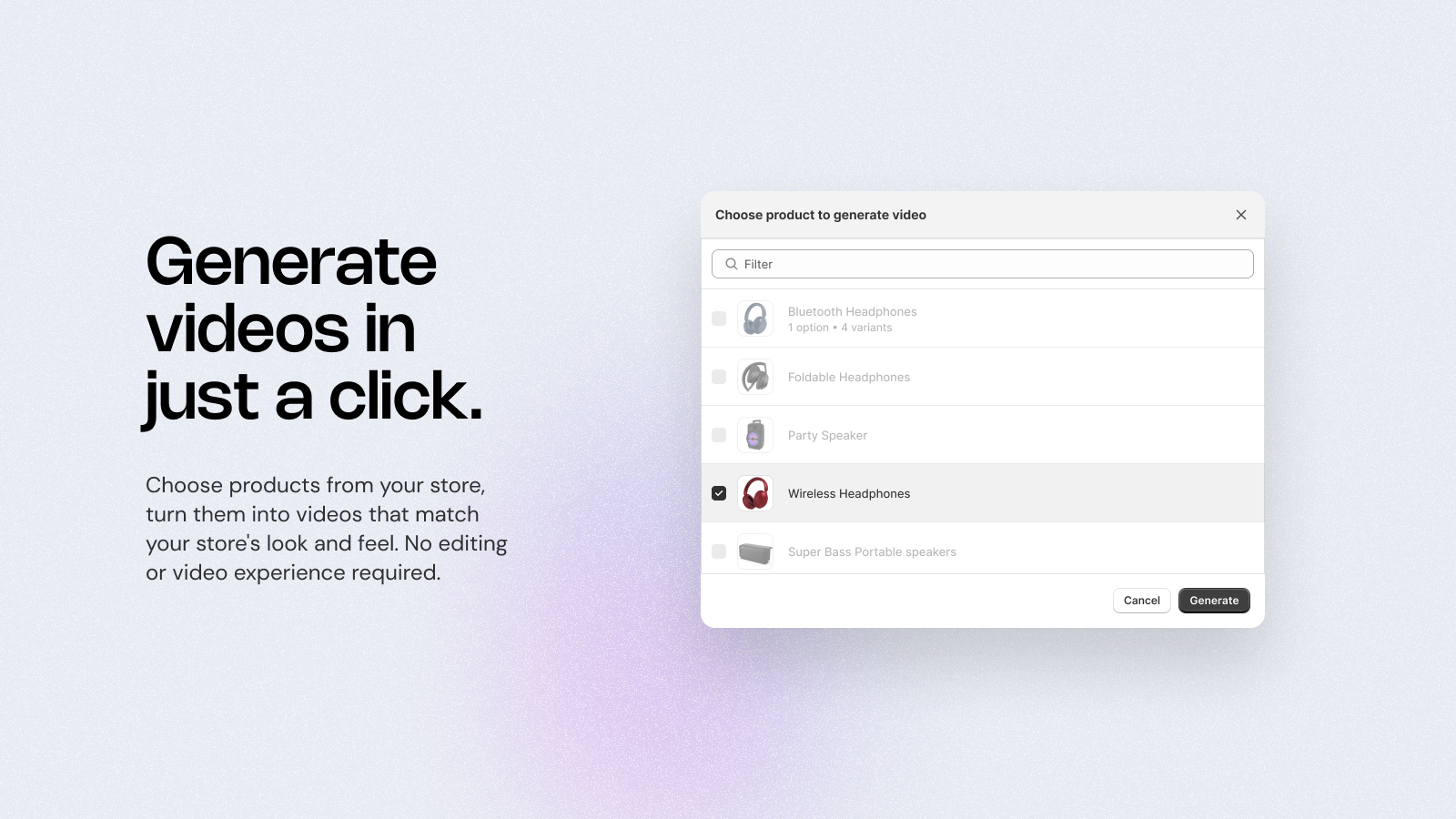 High-performing, ready-to-use Ad videos, generated for your store using AI.