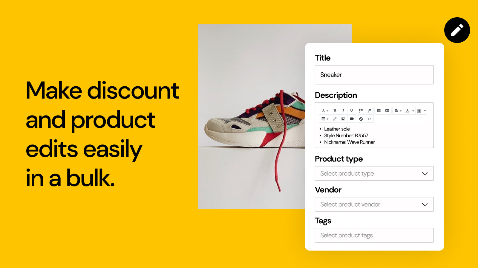 Bulk edit product descriptions, tags, prices, SEO, and more