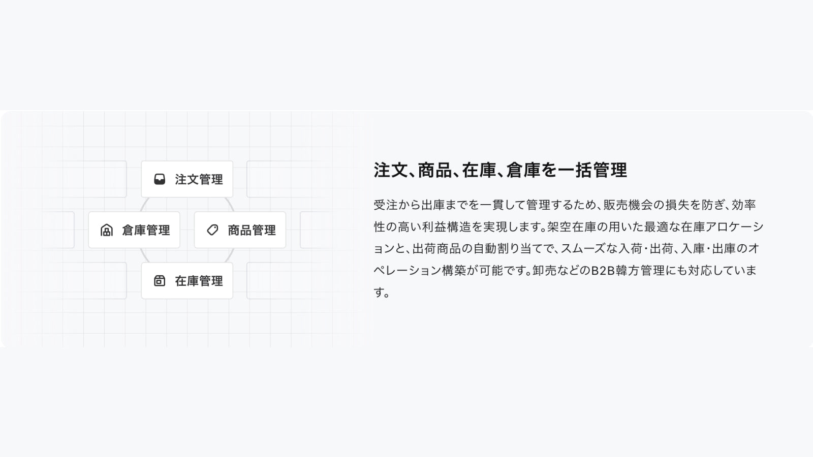 SQで管理されている商品データ・PIM情報・在庫情報・出荷実績などがストアに自動で連携されます。ストアで発生した注文データも自動的にSQに連携され、後続の処理へシームレスに繋がります。